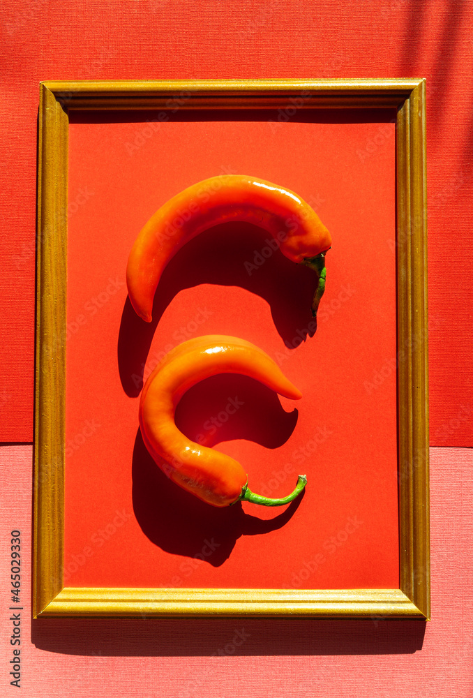 Flat lay Red fresh hot chili pepper in a frame on red and pink background.