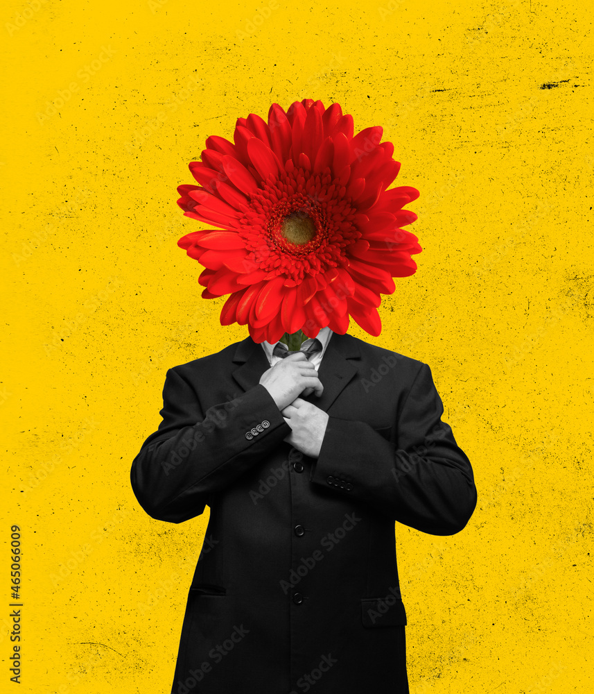 Contemporary art collage, modern design. Retro style. Young stylish man headed by red gerbera flower. Surrealism