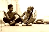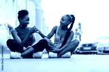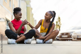 Two young women sitting on the pavement in the city