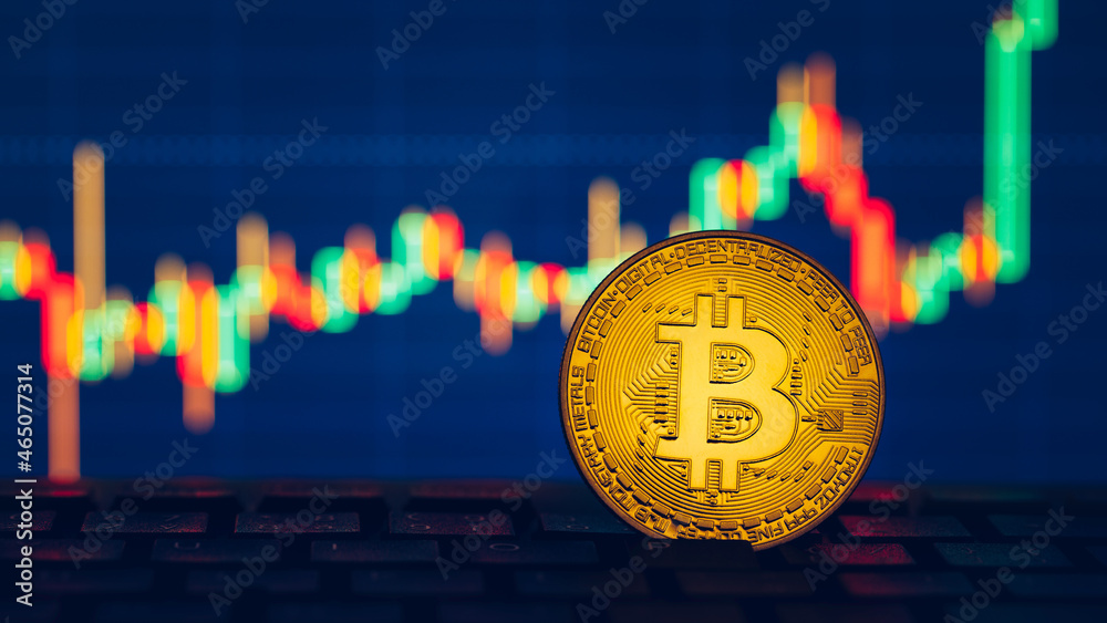 Bitcoin gold coin and defocused chart background. Virtual cryptocurrency concept. Bitcoins on ladder chart cryptocurrency concept. Bitcoin currency with blockchain concept.