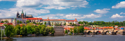 Prague scenic spring aerial view of the Prague Old Town pier architecture Charles Bridge over Vltava river in Prague, Czechia. Old Town of Prague with the Castle in the background, Czech Republic.