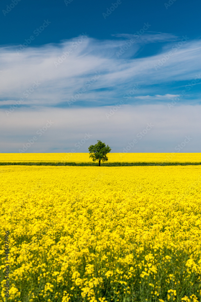 Tree in field of rapeseed under blue sky with clouds, spring landscape. Lone tree in yellow rape-seed field.