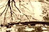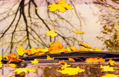 Car hood and glass with yellow leaves in the background. the windshield of the car is covered with fallen autumn leaves. autumn season.