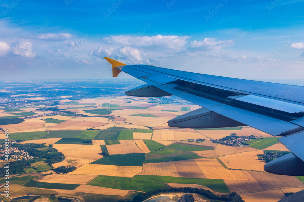 View of the wing of an airplane flying above the clouds at high altitude under a blue sky from the passenger window. In flight over Europe. View of jet airplane wing flying in blue sky over clouds.
