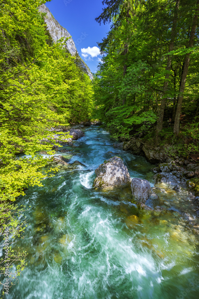 Cold mountain stream coming from Savica waterfall, river Sava near lake Bohinj, Slovenian Alps, Slovenia. The Sava Bohinjka is a headwater of the Sava River in northwestern Slovenia.