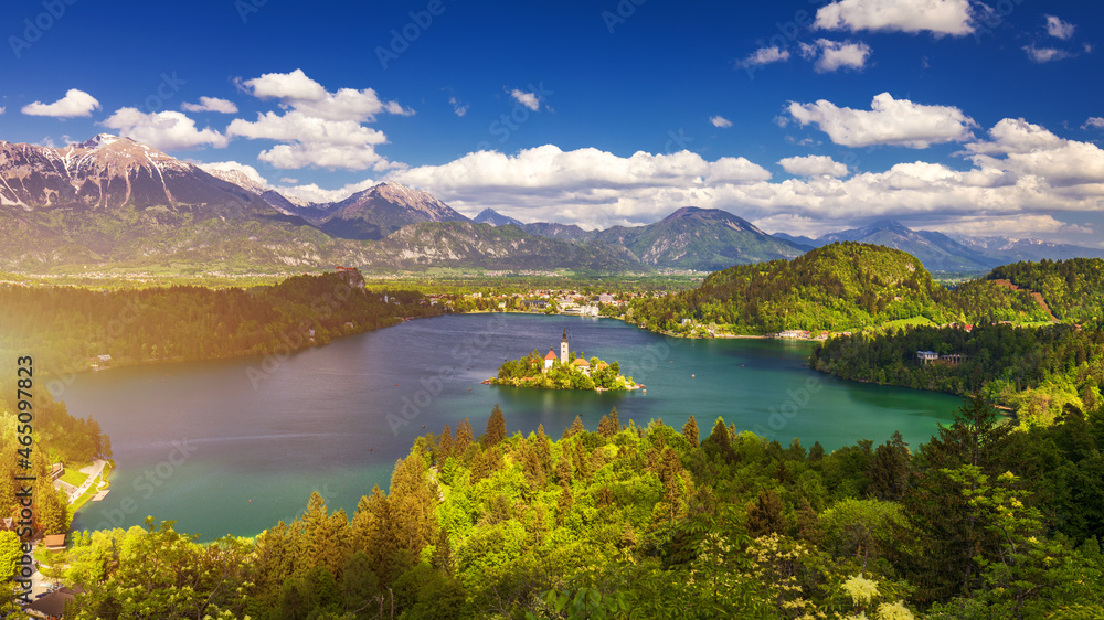 Lake Bled with St. Marys Church of Assumption on small island. Bled, Slovenia, Europe. The Church of the Assumption, Bled, Slovenia. The Lake Bled and Santa Maria Church near Bled, Slovenia.