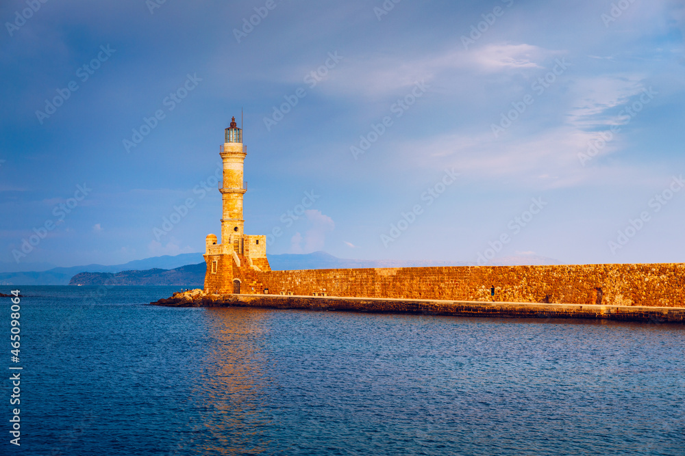 Panorama of venetian harbour waterfront and lighthouse in old harbour of Chania, Crete, Greece. Old venetian lighthouse in Chania, Greece. Lighthouse of the old Venetian port in Chania, Greece.