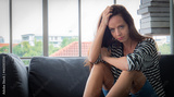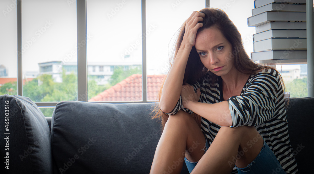 Concept of depression. Young woman, Caucasian white. Depressed, anxious, meditating on the long sofa in the living room at home. showing dissatisfaction
