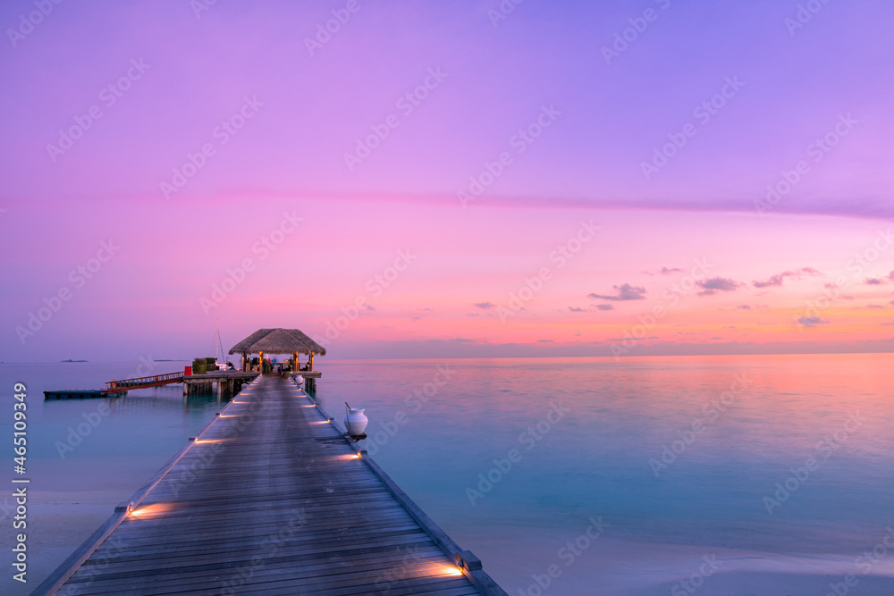 Stunning colorful sunset sky with clouds seaside horizon. Lagoon landscape in Maldives. Luxury traveling destination, exotic summer beach view. Tropical vacation and summer holiday background concept