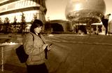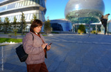 Woman in her thirthies using her phone walking