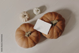Autumn still life. Closeup of blank business card, invitation mockup. Orange and white pumpkins on beige background. Fall stationery. Halloween, Thanksgiving holiday. Flat lay, top view, no people.