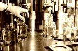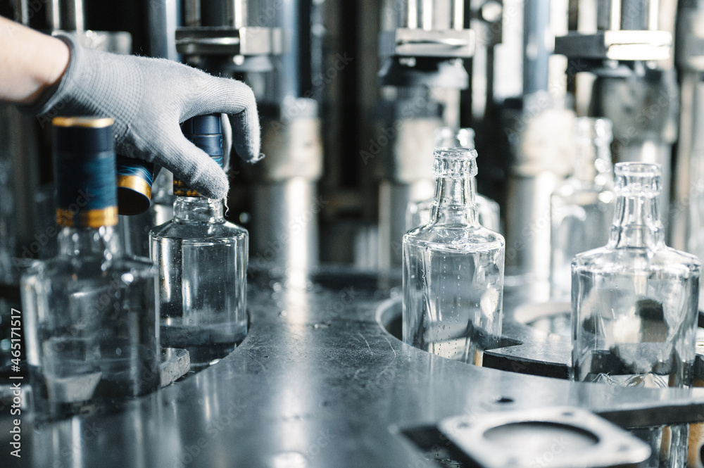 Worker puts plastic cap on bottle of luxury vodka in shop