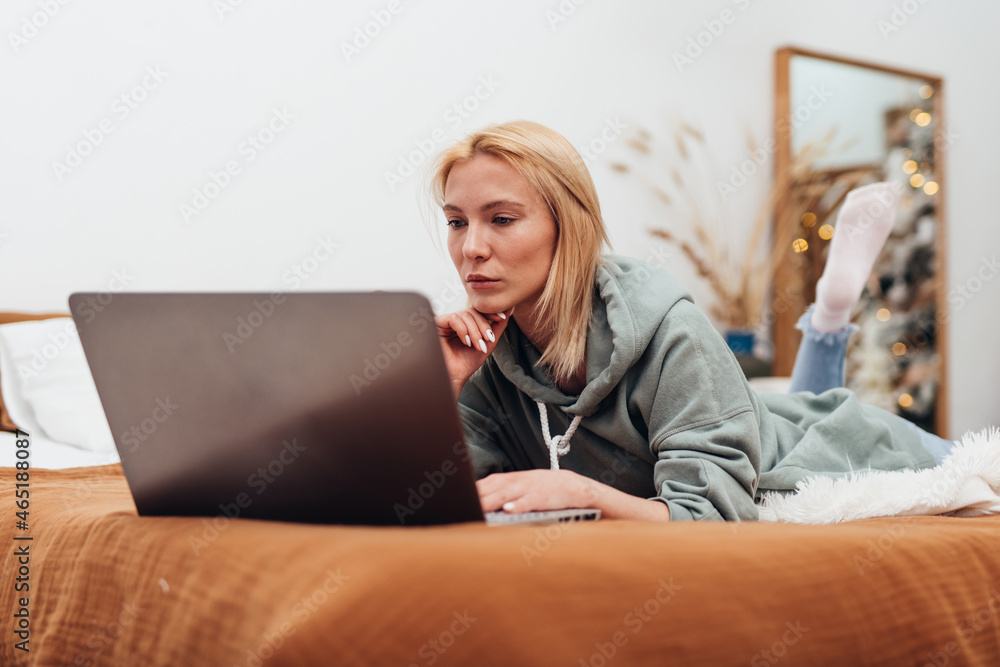 Woman Lying On Sofa At Home Using Laptop Computer.