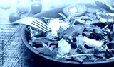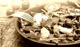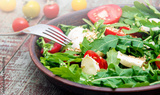 Green salad made with arugula, tomatoes, cheese mozzarella balls and sesame on plate