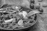 Green salad made with arugula, tomatoes, cheese mozzarella balls and sesame on plate