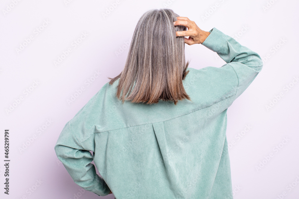 middle age gray hair woman thinking or doubting, scratching head, feeling puzzled and confused, back or rear view