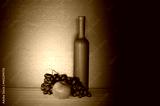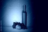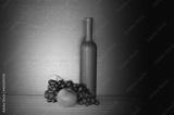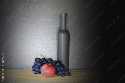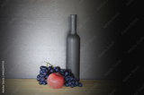 Beautiful modern still life with bottle of wine, red apple and bunch of blue grapes on gray background