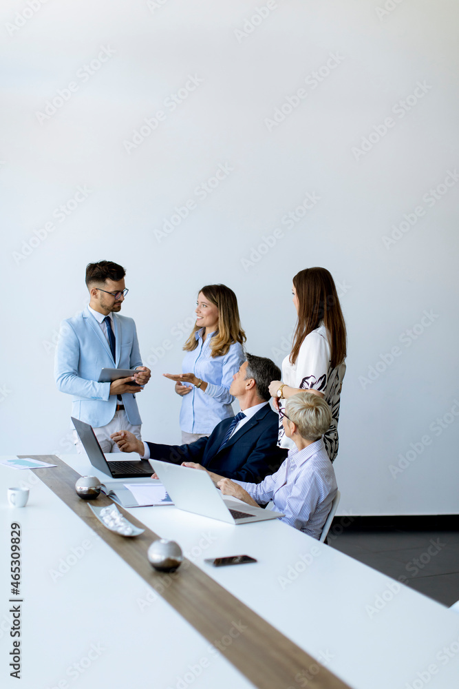 View at group of business people working together and preparing new project on a meeting in office
