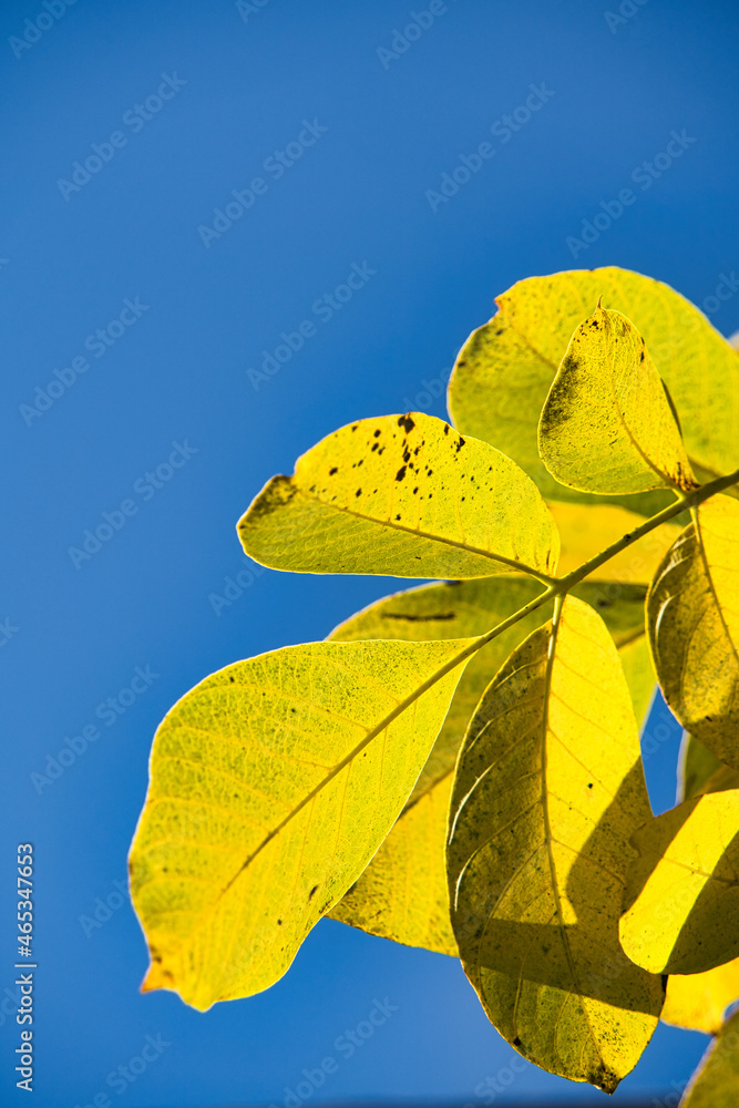 Autumn background.Bright yellow leaves illuminated by the sun against the blue sky.Walnut leaves.