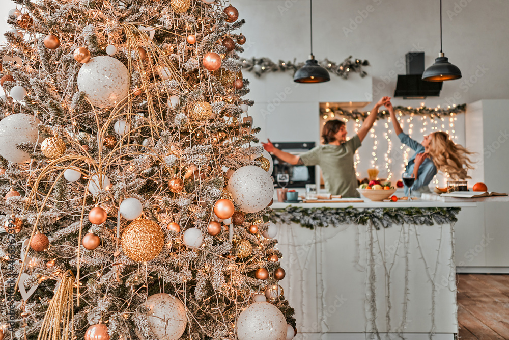 Happy young couple dancing in cozy kitchen with Christmas tree. Focus on the Christmas tree in the foreground