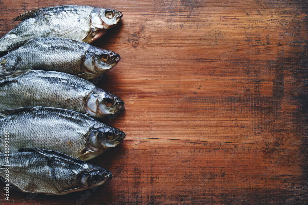Dried salted fish - bream, blue bream on an old wooden table surface, top view, copy space.