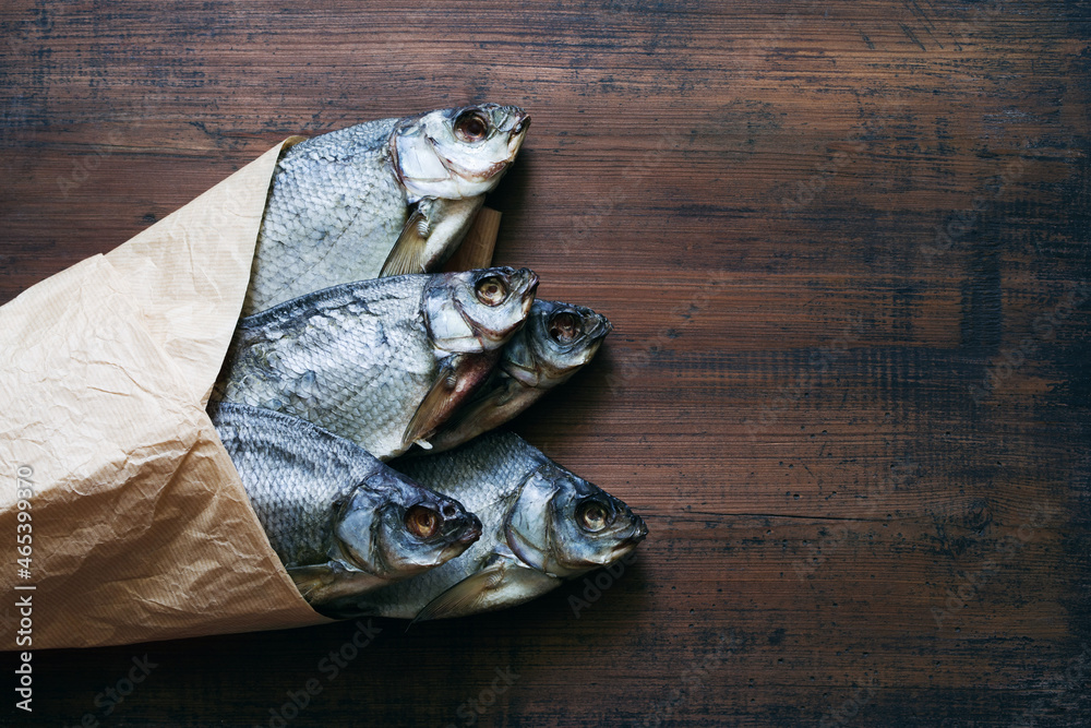 Bouquet of dried salted river fish in a paper wrapper on an old wooden table surface, top view. Gift for a man, men's day, father's day