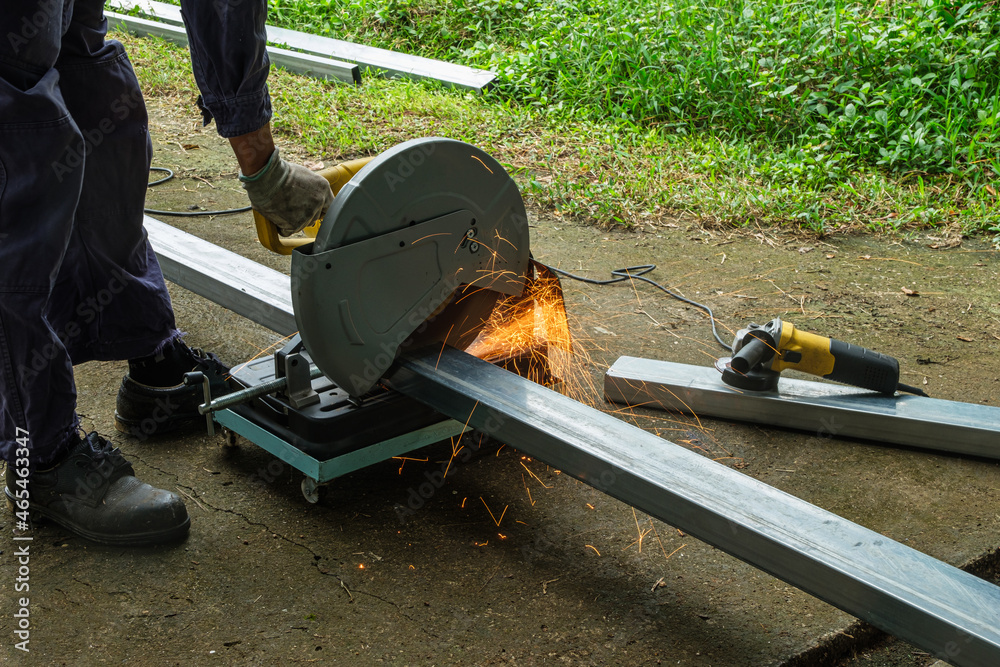 A worker using a fiber machine cutting steel roof structure ,with sparks and wearing equipment a safety protection