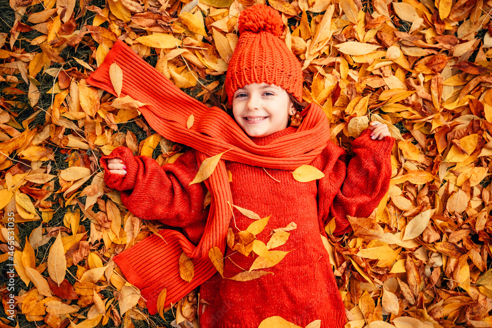 Autumn park and happy little girl playing with fallen tree leaves