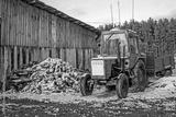 A tractor with a trailer is parked near a pile of birch firewood