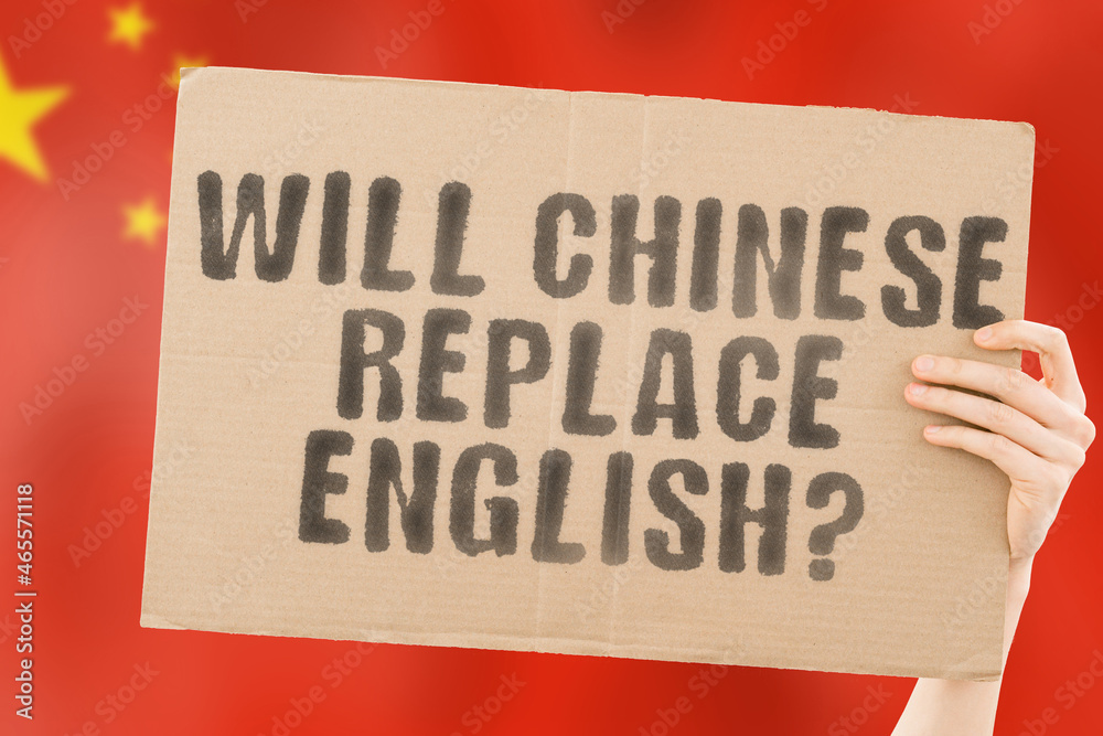 The question " Will Chinese replace English? " on a banner in men's hand. Communication. Deal. Dialogue. Economic. Educate. Teach. Educational. Improve. Tutor. Globalisation. Network. Global