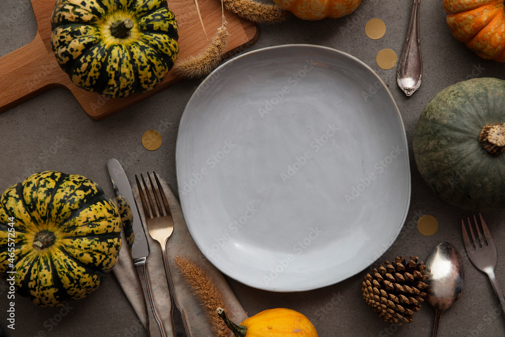 Overhead autumn thanksgiving dinner place setting with pumpkins cutlery and an empty plate