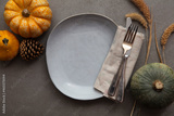 Overhead autumn thanksgiving dinner place setting with pumpkins cutlery and an empty plate