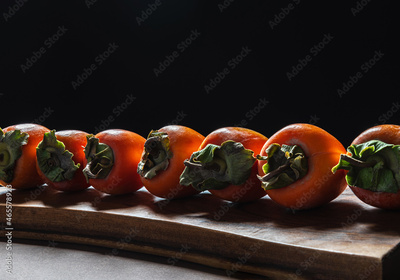 Ripe orange persimmons. Fresh persimmon on a wooden board. Set of persimmons on a dark background.