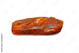A piece of oblong amber on a white background. Polished semi-precious colored mineral. Material for jewelry. Copal. Ancient fossil resin. Sun stone. Crystal. Geology and minerals