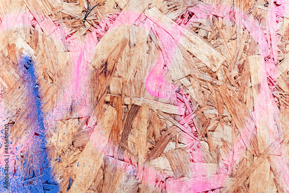 Particleboard chipboard texture with pink and blue spray paint heart, waste-wood product, wood chips, sawmill shavings, sawdust