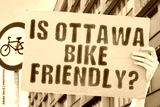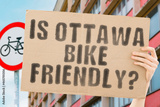 The question " Is Ottawa bike friendly? " on a banner in men's hand with blurred background. Transportation. Zero waste. Bicycle lane. Streets. City. Safety. Insecure. Road signs. Dangerous