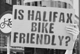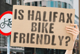 The question " Is Halifax bike friendly? " on a banner in men's hand with blurred background. Transportation. Zero waste. Bicycle lane. Streets. City. Safety. Insecure. Road signs. Dangerous