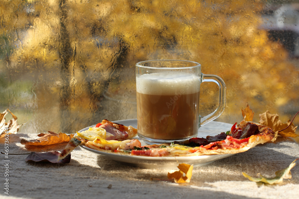 cup of frothy cappuccino and slices of pizza on a plate against the background of a window after the rain. autumn breakfast