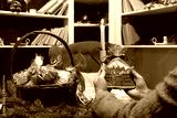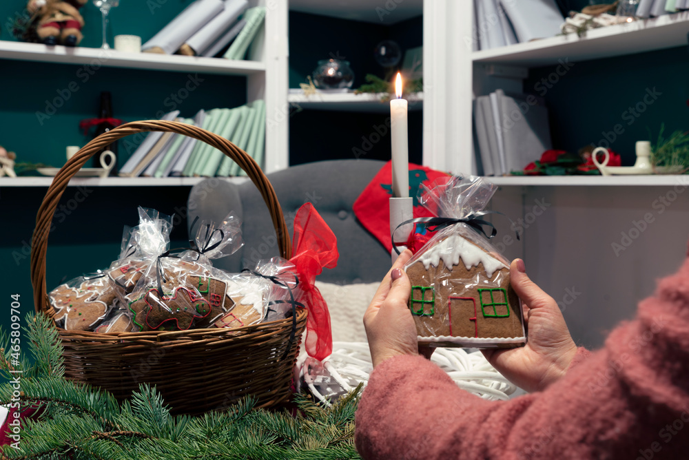 Woman's hands holding gingerbread house as a gift for christmas. Christmas table with decoration with basket of gingerbreads and candle in a room. Preparation for celebration.