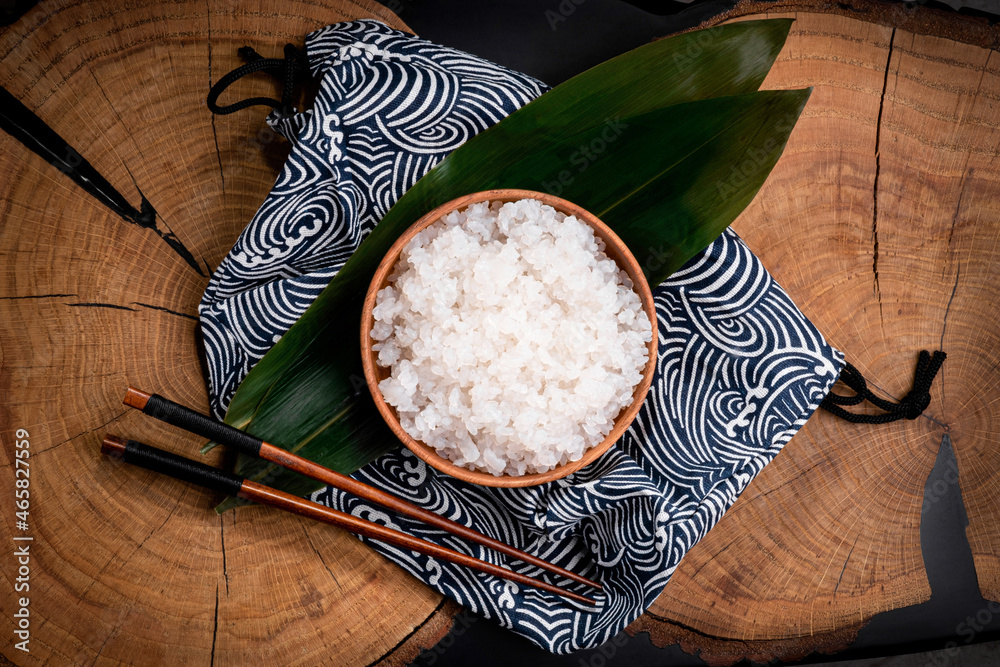 Shirataki rice or noodles on wooden table background. Konnyaku from konjac yam for wok. Healthy japanese diet. Gluten free and carbs free KETO food. Traditional oriental style. Lunch bag. Close up