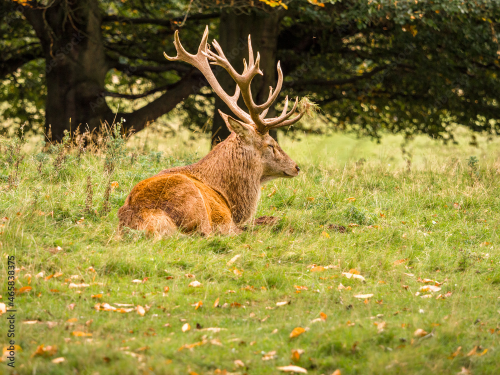 Larger roe deer stag chilling out at Tatton Park during the rutting season, Knutsford, Cheshire, UK
