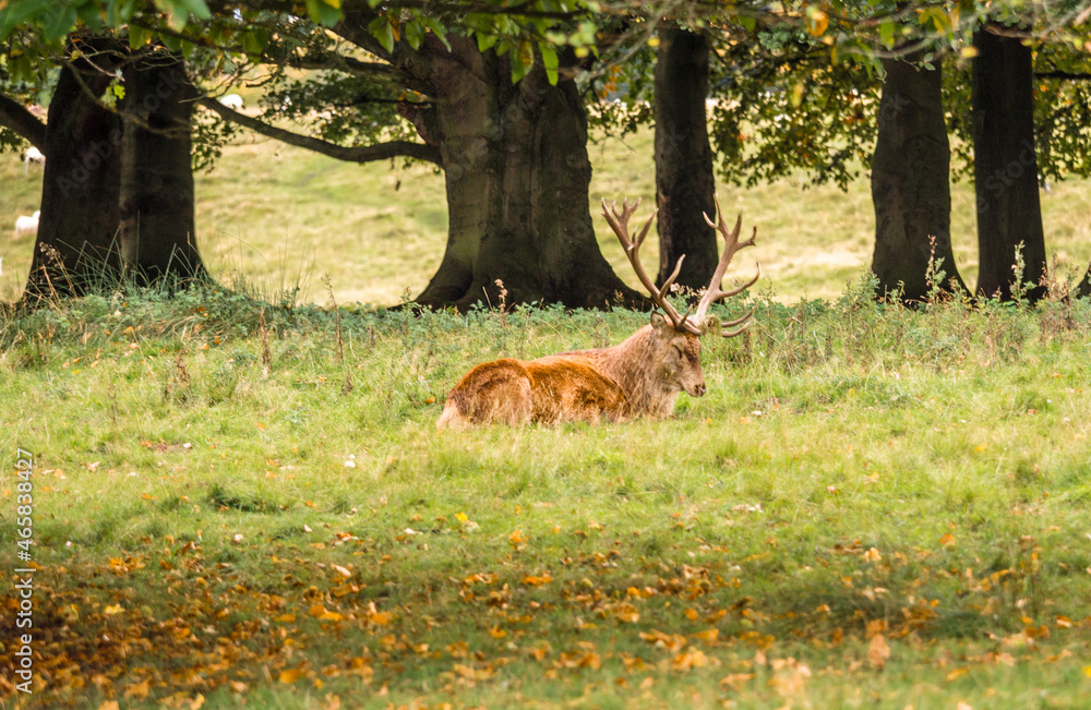 Larger roe deer stag chilling out at Tatton Park during the rutting season, Knutsford, Cheshire, UK