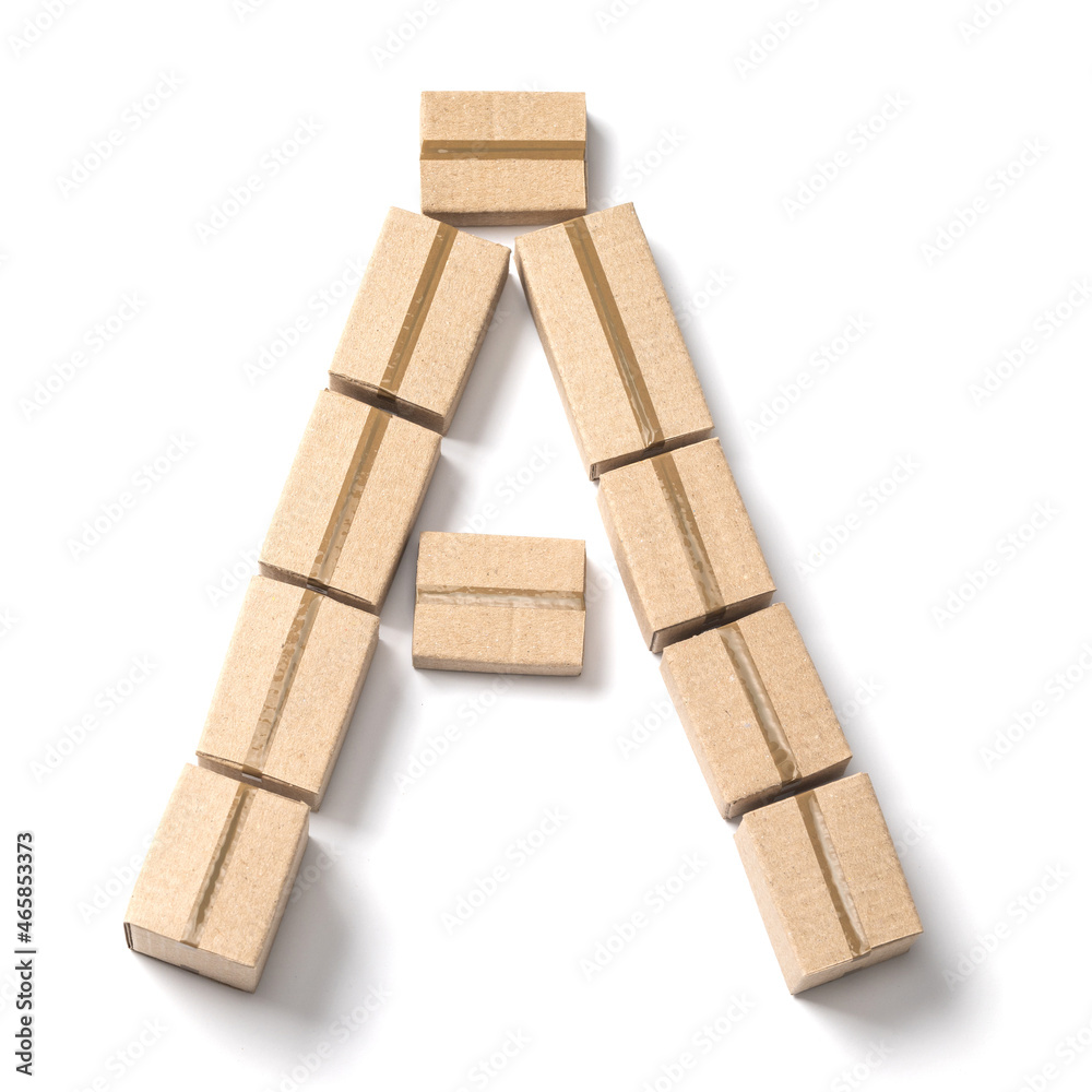 Letter A. Alphabet from cardboard boxes for delivery isolated on white background