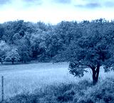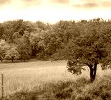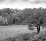 Tree with red leaves in Autumn, on hill of yellow grass with a gentle slope. Forest at bottom of hill, blue sky with clouds above. Jockey Hollow, Morristown National Historical Park, New Jersey, USA.
