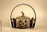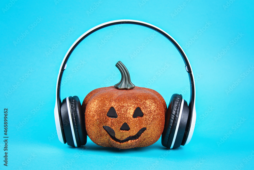 Orange pumpkin in white wireless headphones on a blue background. Halloween concept and audio.