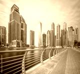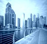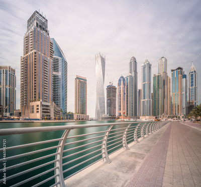 Day view of Dubai Marina bay with cloudy sky, UAE