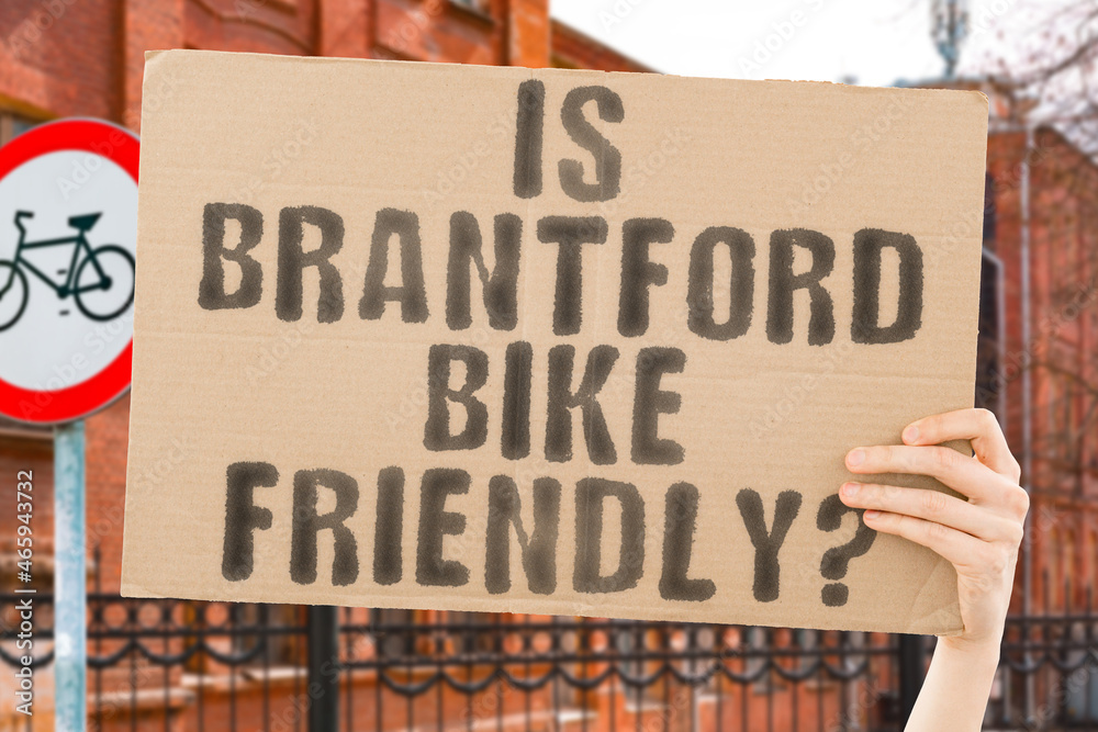 The question " Is Brantford bike friendly? " on a banner in men's hand with blurred background. Transportation. Zero waste. Bicycle lane. Streets. City. Safety. Insecure. Road signs. Dangerous