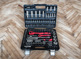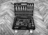 Set of chrome vanadium wrench tools and nuts in black box