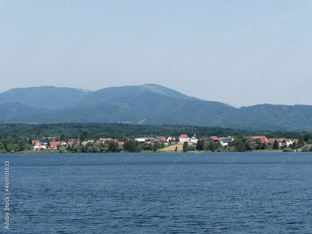 Le village de Michelbach au bord du lac en Alsace dans le Haut-Rhin dominé par les massifs des Vosges du Rossberg au Kuppeithannkopf