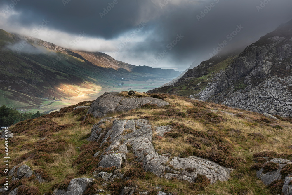 Epic Autumn landscape image of view along Nant Fracon valley in Snowdonia National Park with dramatic evening sky and copy space